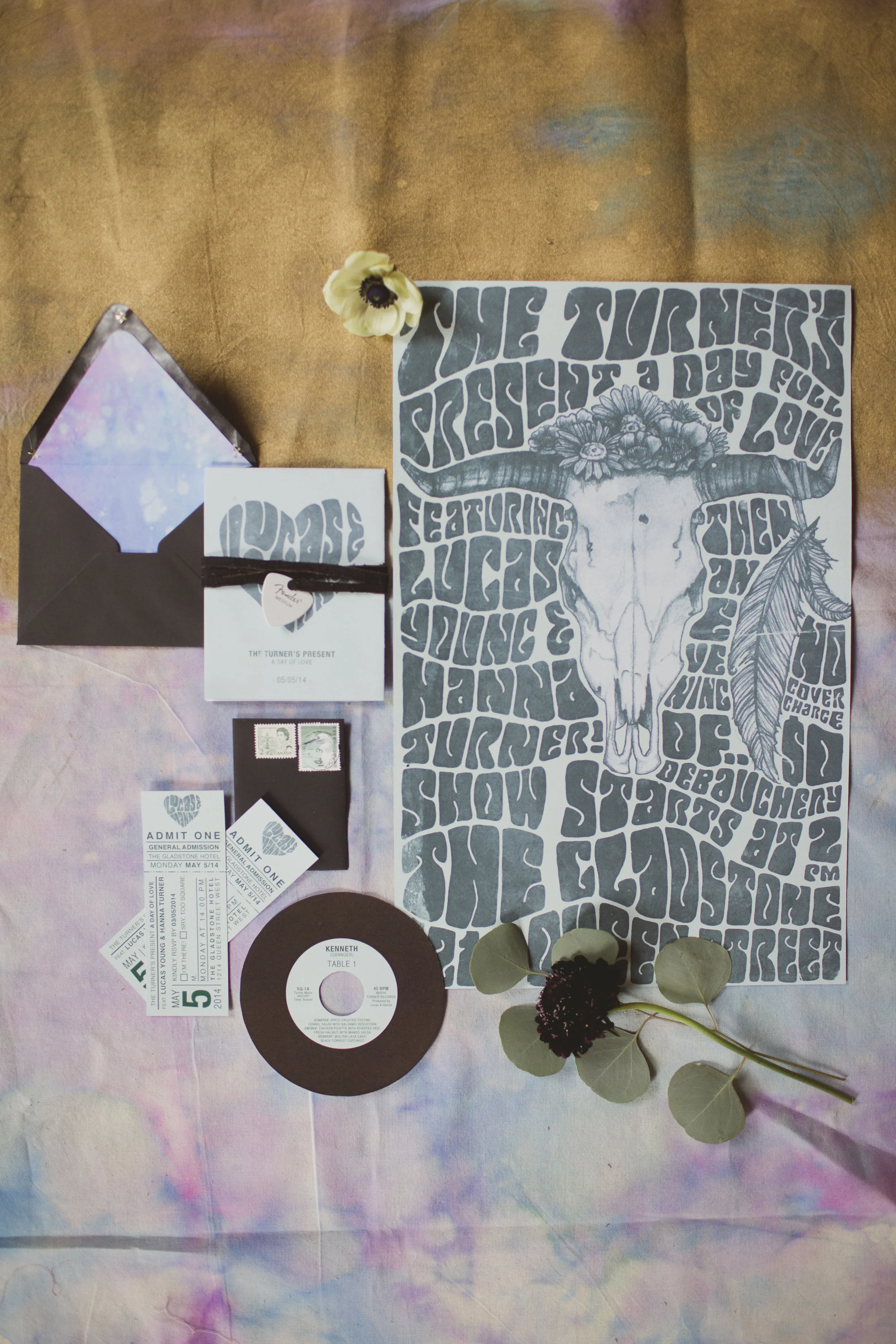 Love by Lynzie also noted that some of her favourite details of this shoot was the Rock N' Roll poster wedding invitation set illustrated by Beet & Path Designs, complete with a custom guitar pick, studded leather placemats and a tie dyed runner that her team handcrafted.