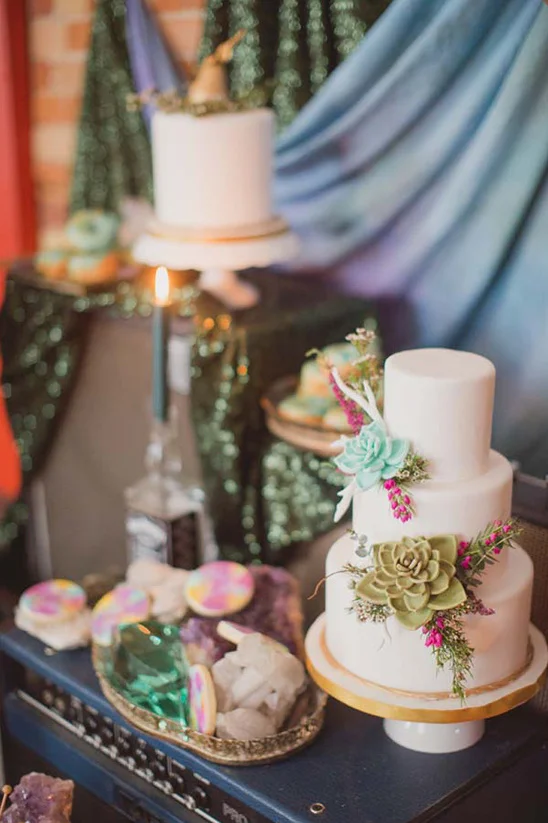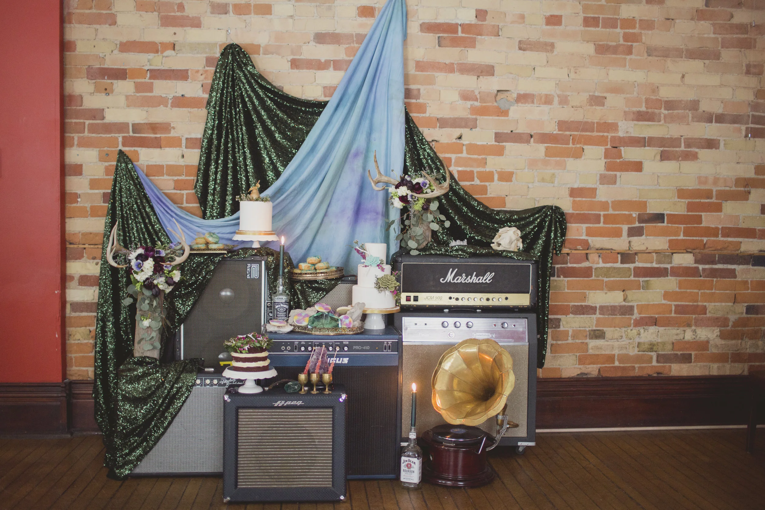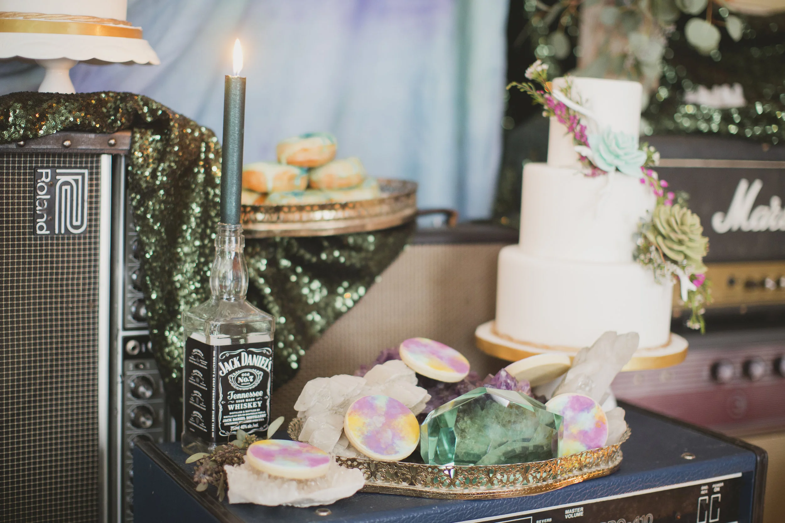 A sweets table was created from vintage and modern guitar, bass and keyboard amps and leave it to Lynzie for ingenius ideas, if you look closely she used old Jack Daniel bottles for candle holders!